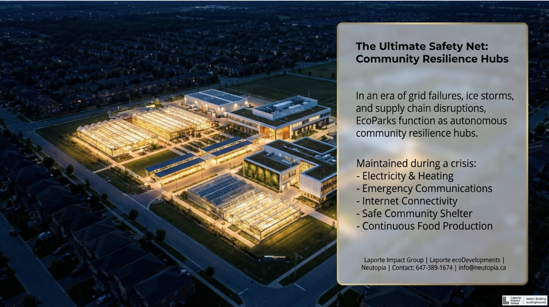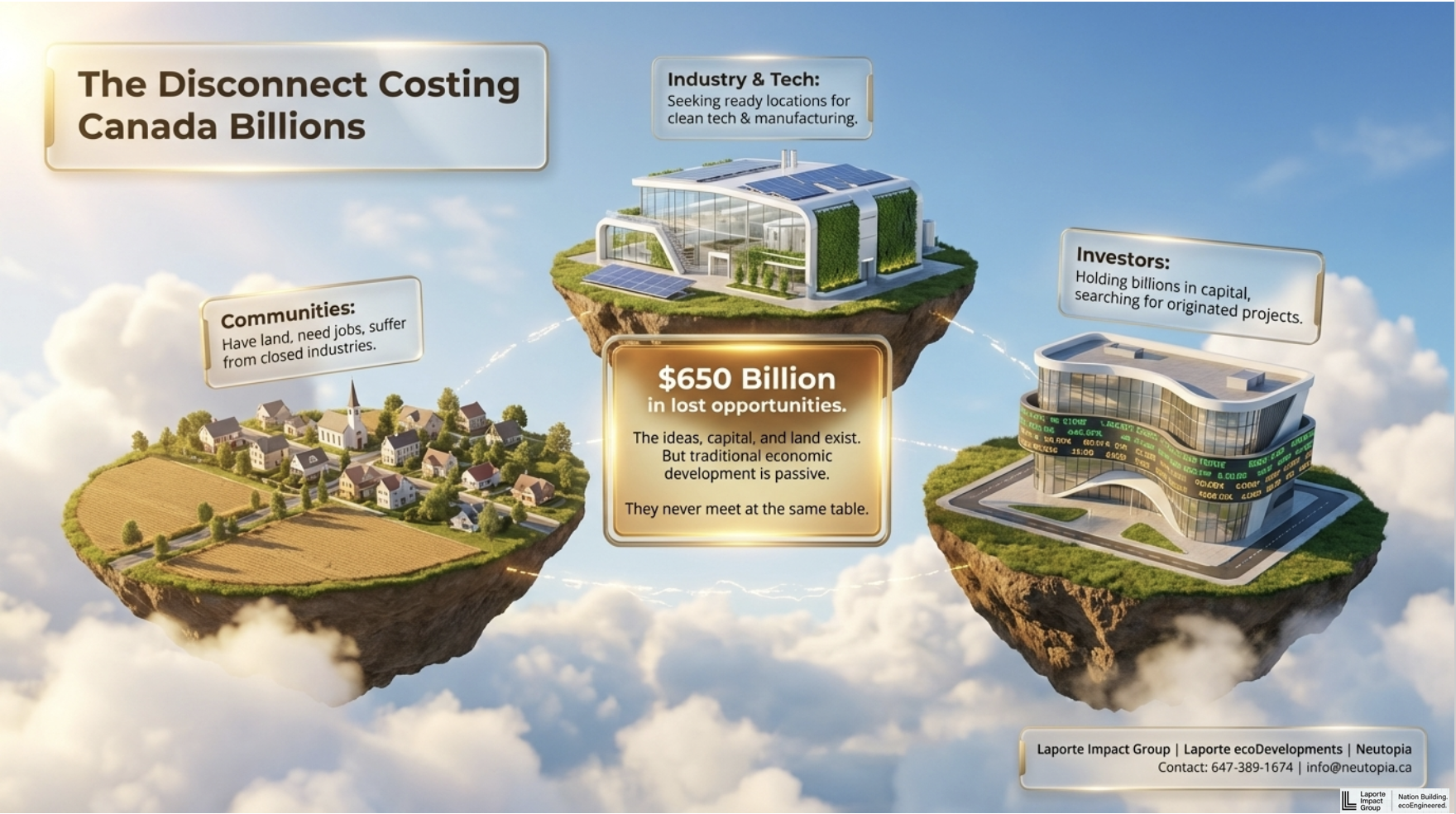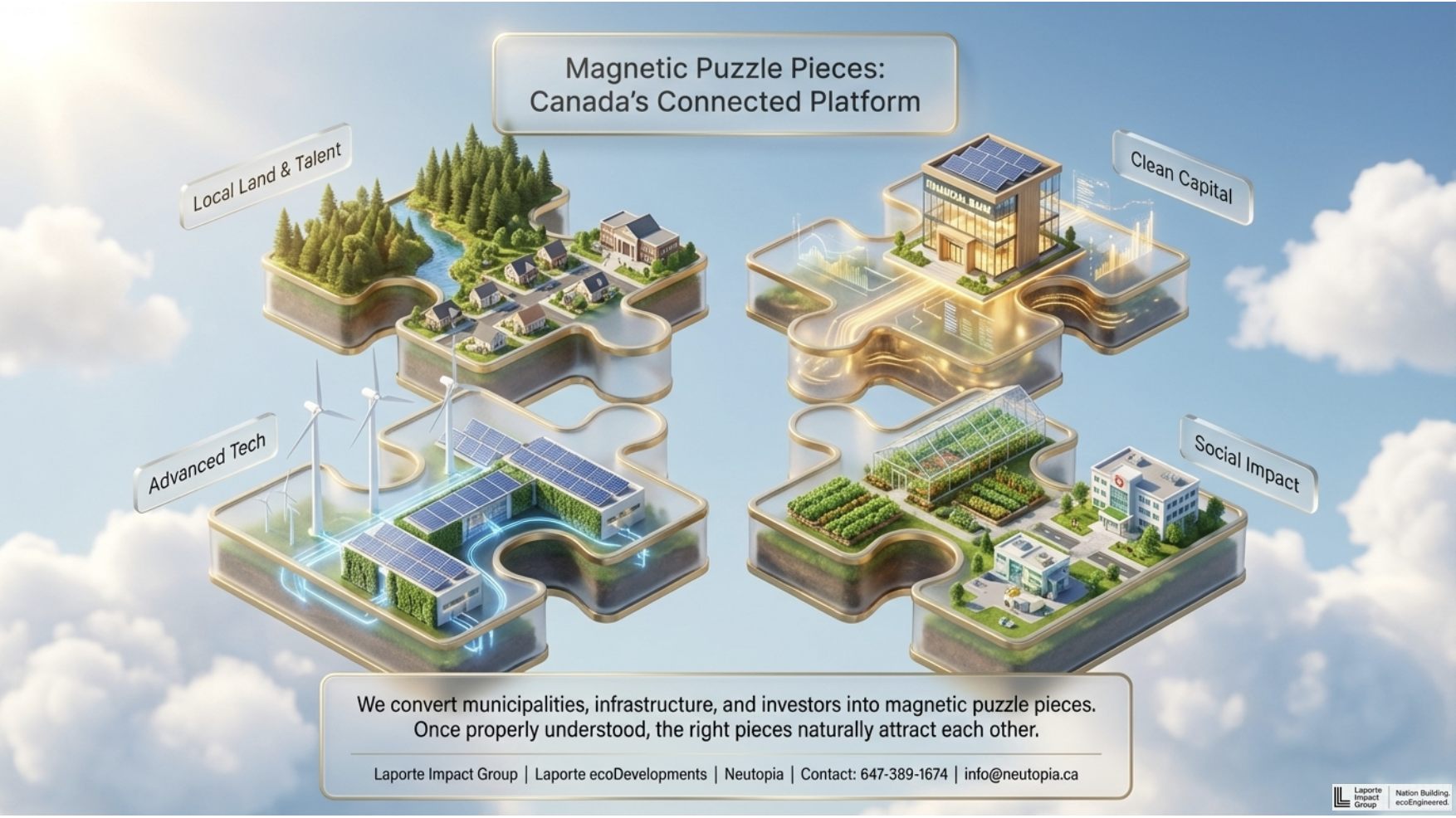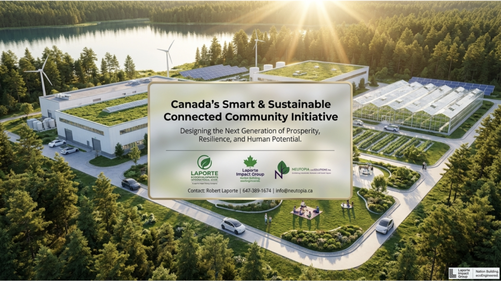Neutopia is part of Canada’s only fully integrated Green Community and Housing Solutions network. While Neutopia focuses on the upstream scientific and technical aspects, we can help you understand options you never knew were even possible. We are currently managing a growing portfolio that has fast exceeded $3 Bn in Canadian Development projects, so If you have land or property do NOT delay; our ERS Development Program can help align and unlock $Millions for ecoParks, Industrial Clean Energy and Conservation projects, Critical Minerals, Next-Gen Manufacturing, even new housing projects whether for an individual lot or an entire community development initiative. We’re your single source network for a Life Changing Opportunity; because we manage everything from initial concepts and feasibility in upstream development through to coordinating with the proper entities for further downstream construction and asset management through our family of companies, the Laporte Impact Group. We’ve created a single source for technical expertise and unlocking private funding – ZERO TAXPAYER MONEY INVOLVED –and that makes us very special for every community so they can save taxpayers money for roads and bridges and schools and hospitals and support for long term care etc. We are an intricately crafted network of expertise, a very unique trait in any company on this planet, and that’s just one of the things that makes our relationships with new partners and communities so valuable.