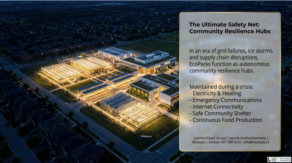 By integrating clean energy, conservation systems, local food infrastructure, and essential services into a single coordinated framework, EcoParks enable communities to maintain functionality when centralized systems fail — while delivering superior day-to-day efficiency under normal conditions.